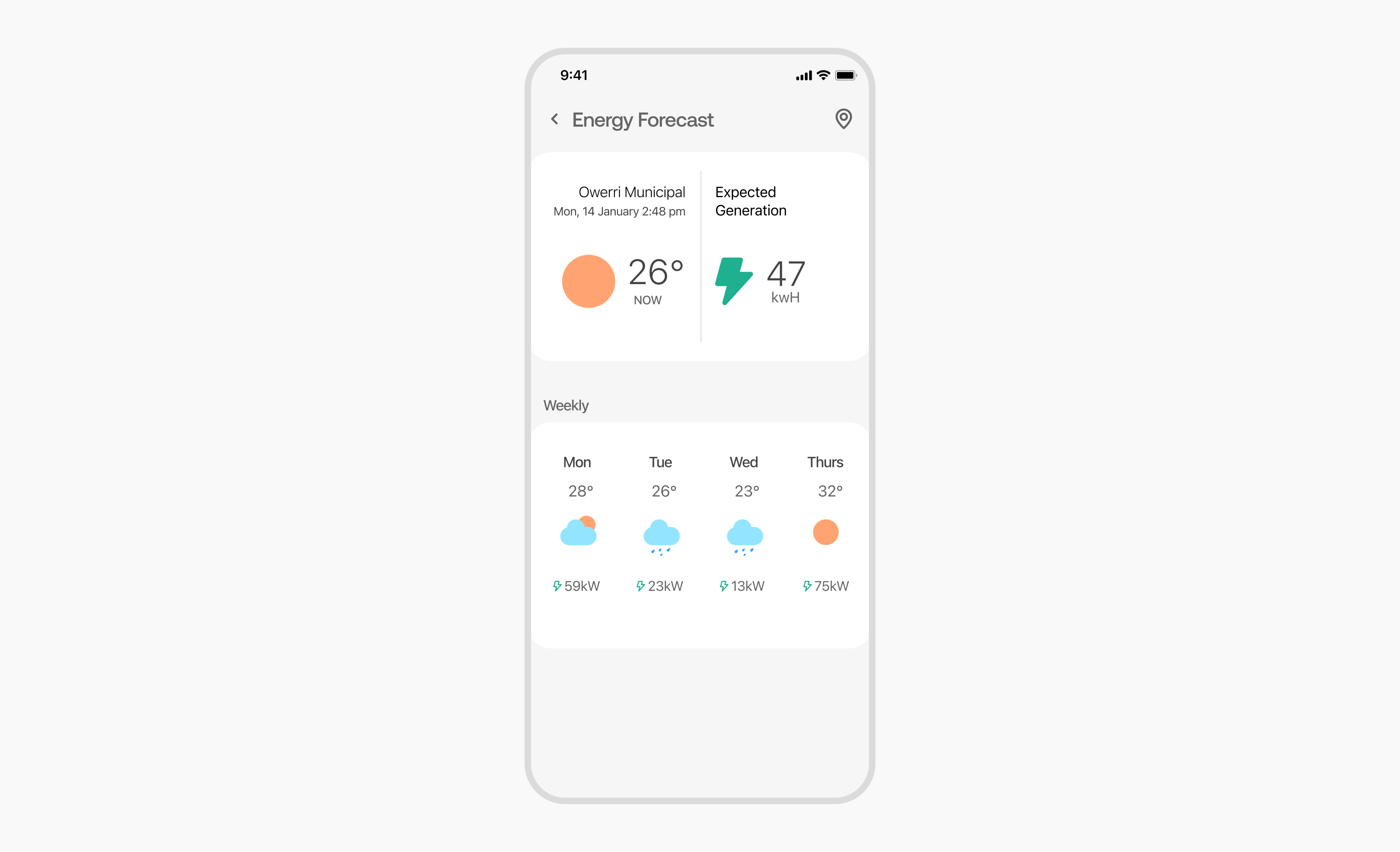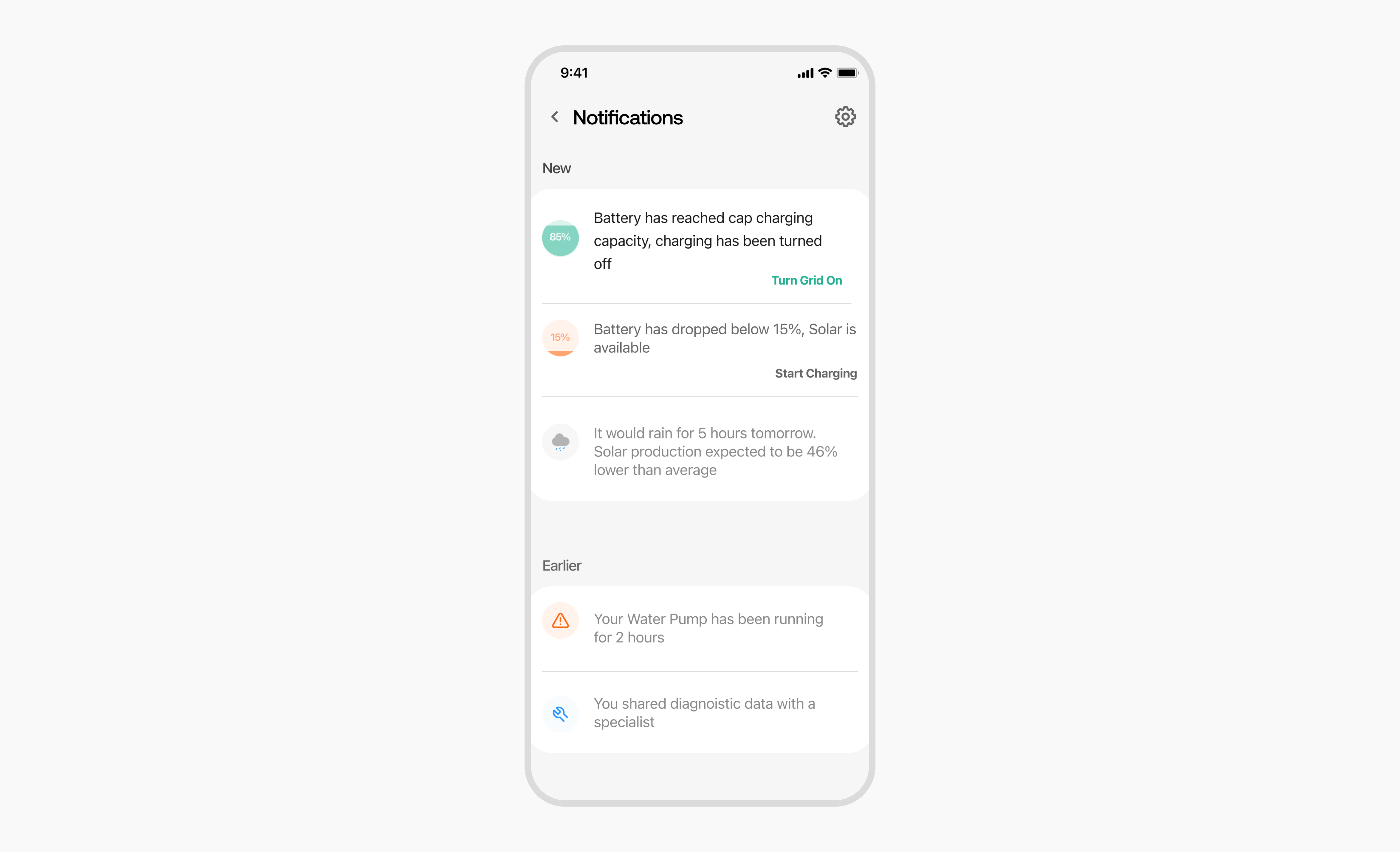 The device detail screen provides more information about a particular device connected to the app. This screen allows users to view detailed information about a device such as its current status, energy production, temperature, and more.